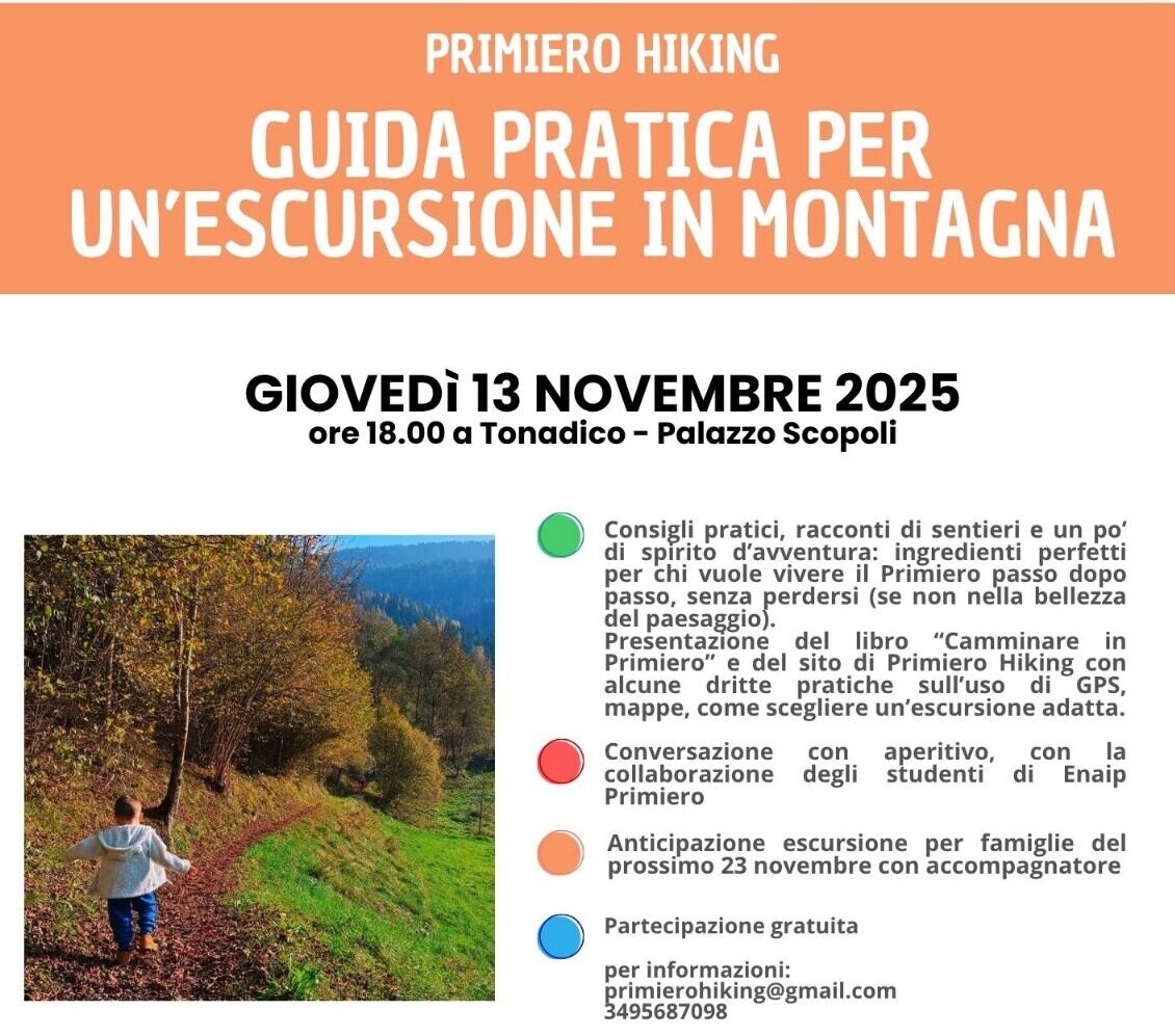 Un incontro pensato per chi ama mettersi in cammino — che sia un sentiero tra boschi e malghe o una semplice passeggiata panoramica — e vuole imparare a orientarsi meglio, scegliere l’itinerario giusto e programmare al meglio le proprie uscite. Consigli pratici, racconti di sentieri e un po’ di spirito d’avventura: ingredienti perfetti per chi vuole vivere il Primiero passo dopo passo, senza perdersi (se non nella bellezza del paesaggio).